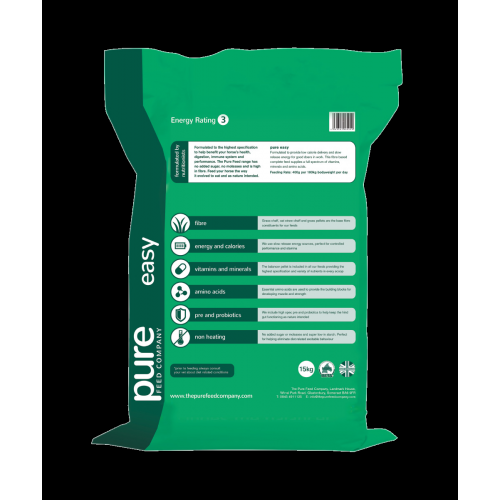 Pure Easy provides slow-release energy for horses in work, but is low calorie so doesn’t encourage weight gain. It is high in fibre which promotes good hind gut health. It contains our premium balancer which means it comes fully loaded with every vitamin and mineral your horse needs, as well as pre and pro biotics and amino acids. With so much included in one bag, it really is great value when you break down the costs of buying these individual components separately.
